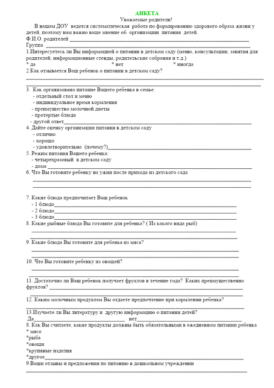 Анкета Для Родителей. Организация И Качество Питания
