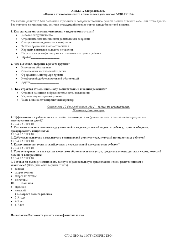 Анкета Для Родителей Псих. Климат Готовая