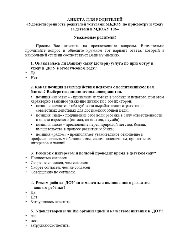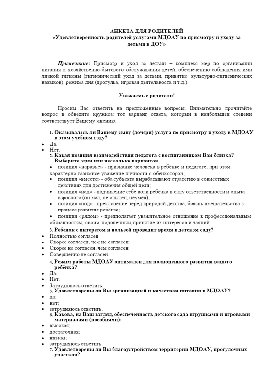 Анкета Для Родителей. Удовлетворенностьзаказчиков Качеством Услуг По Присмотру И Уходу В Доу.