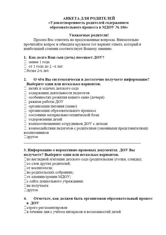 Анкета Для Родителей. Удовлетворенность Родителей Содержанием Образовательного Процессв